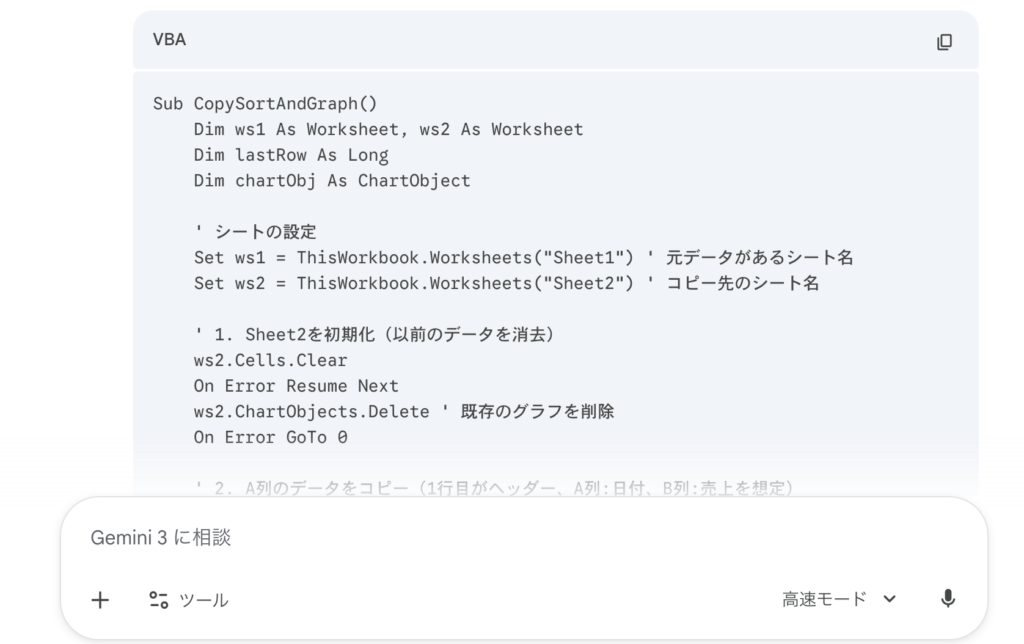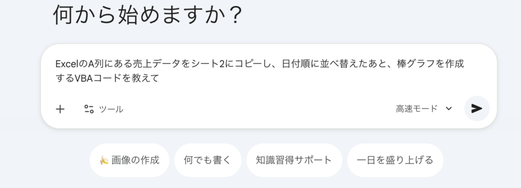 - ステップ①:AIに丸投げする「ExcelのA列にある売上データをシート2にコピーし、日付順に並べ替えたあと、棒グラフを作成するVBAコードを教えて」 このように、「どの列を」「どうして」「どうしたいか」を具体的に伝えます。