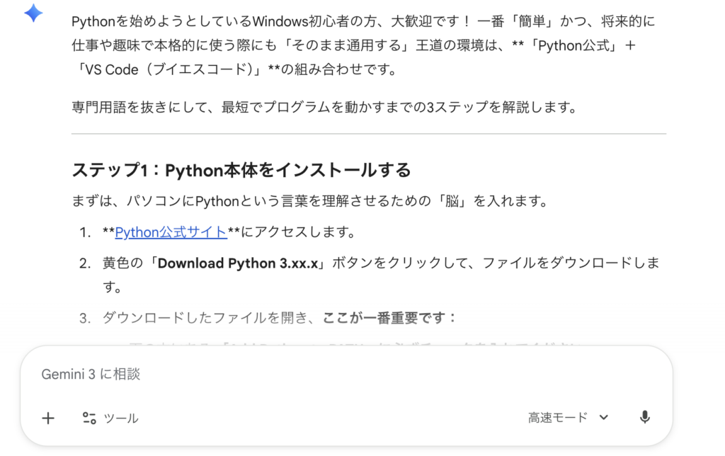 - 「準備」すらAIに聞く「Pythonを始めたいWindows初心者です。一番簡単にコードを実行できる環境を、インストール手順から教えて」 と聞いてみてください。最新かつ最も簡単な方法(Google Colabなど)を、あなたのPC環境に合わせてナビゲートしてくれます。